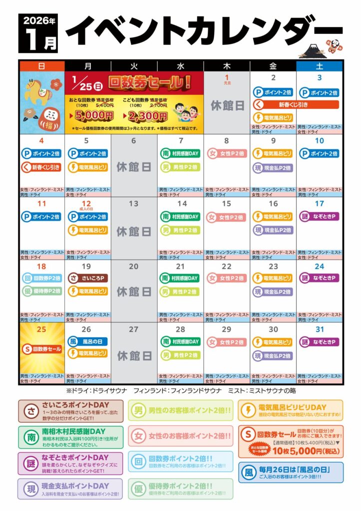 平素より南相木温泉 滝見の湯をご利用いただきまして、誠にありがとうございます。 当館の1月に行われるイベントをお知らせいたします。 皆さまのご来館、心よりお待ち申し上げております。 …