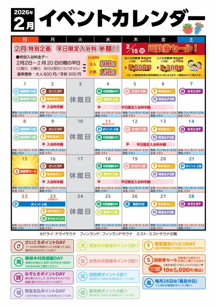 2026年2月イベントカレンダー 2026年1月29日 平素より南相木温泉 滝見の湯をご利用いただきまして、誠にありがとうございます。 当館の2月に行われるイベントをお知らせいたします。 皆さまのご来館、心よりお待ち申し上げております。